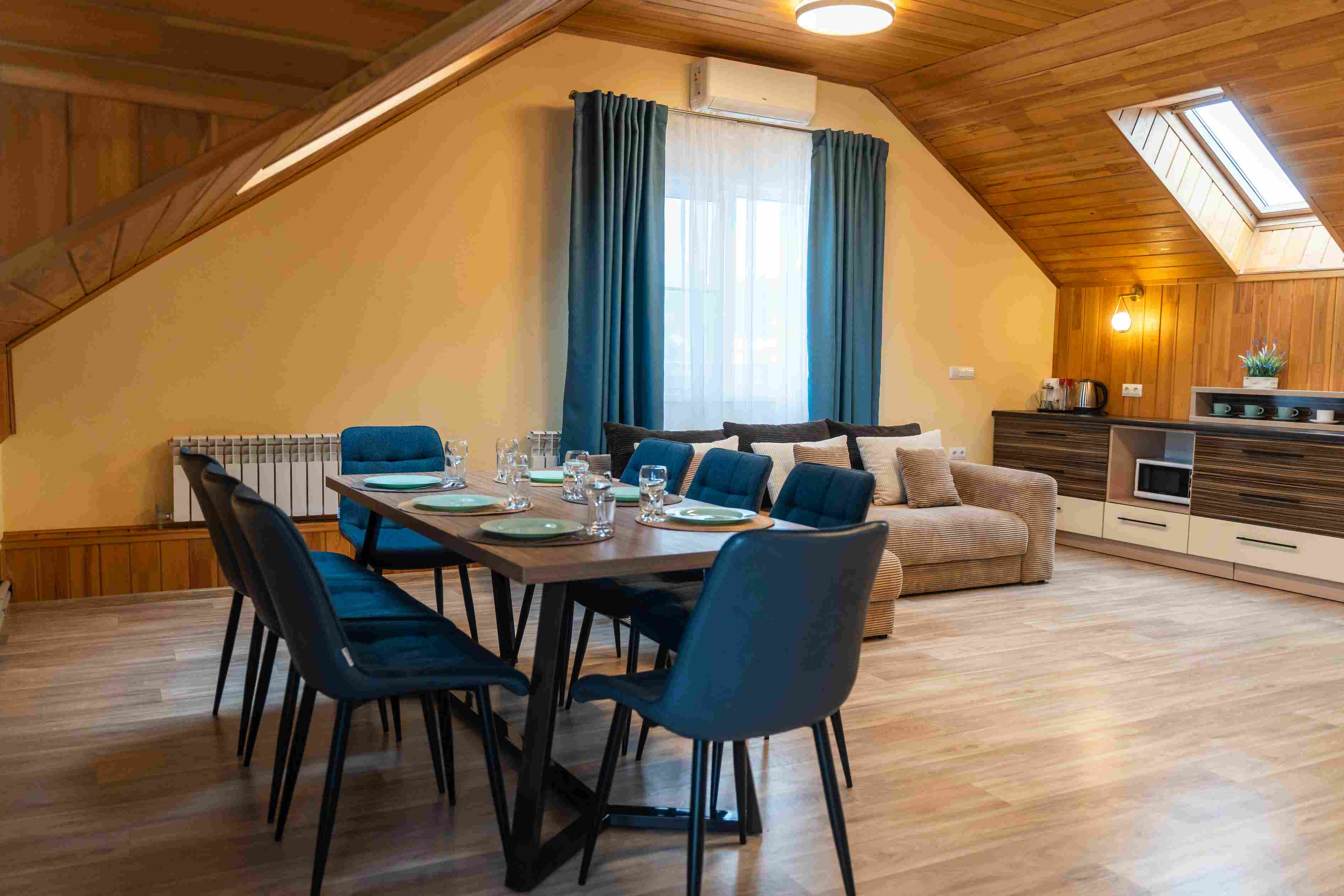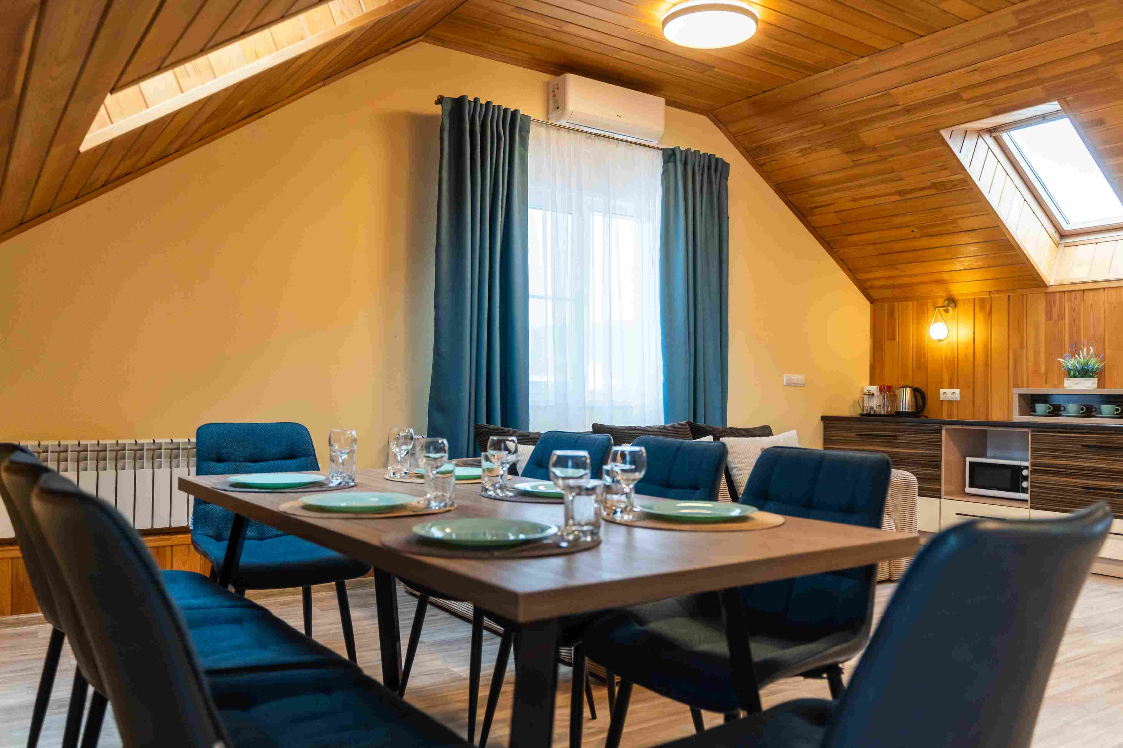 В Гостевой  диван,  большой обеденный стол, телевизор, а также  небольшая кухонная зона – холодильник, чайник, МК-печь и посуда на 7 персон.